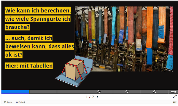 Erklärung und Übungsmöglichkeit zur Feststellung der geeigneten Anzahl von Zurrgurten. Die H5P-Datei steht unter der Lizenz CC0 und kann frei verwendet und verändert werden. Eine Vorschau findet sich hier: https://h5p.org/node/431602